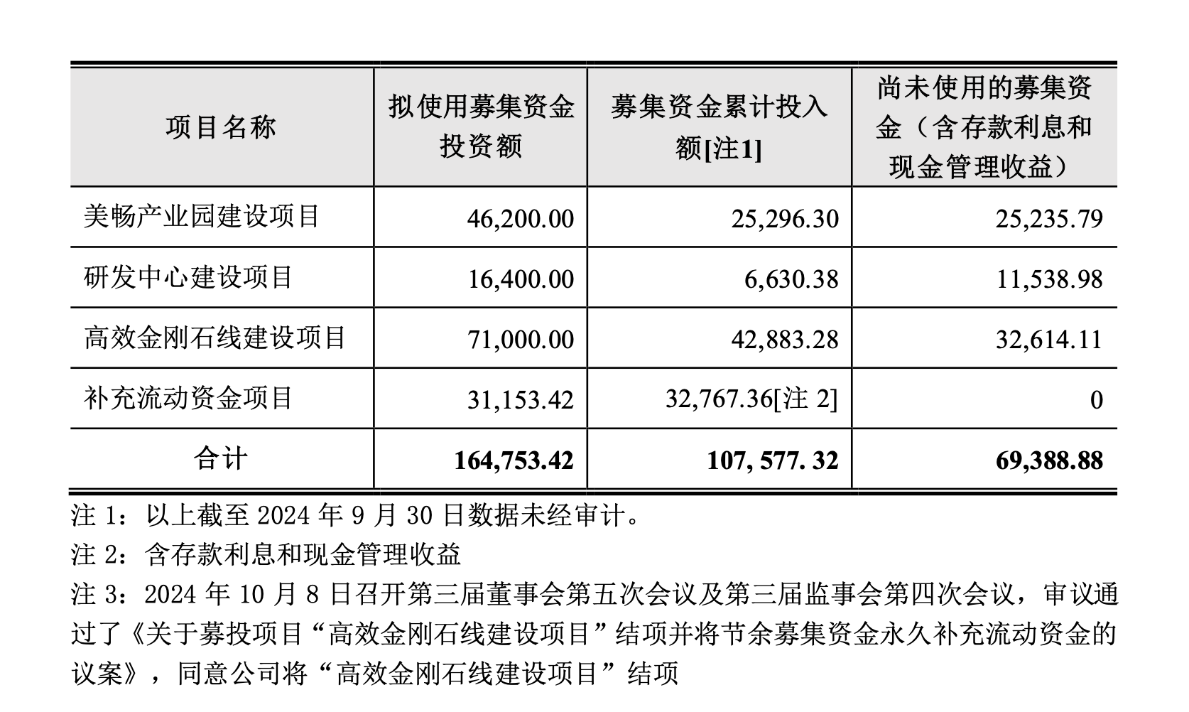 截至9月30日,该公司已在美畅产业园建设项目上,累计投入募集资金约2.53亿元;在研发中心建设项目上,累计投入约0.66亿元;高效金刚石线建设项目和补充流动资金分别约4.29亿元、3.28亿元。