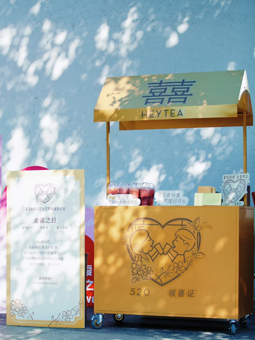 喜茶自2022年起推出了“喝喜茶,领喜证”的活动,在情人节、520、七夕等节点,可以凭结婚证在喜茶线下门店领到双杯饮品,以及印有“囍”字的大红纸袋和杯套,喜茶还会在杯子上打出“我们结婚啦!!!”以及新人名字首字母的标签,同时发放一张“喜证”。据喜茶发布的2023年品牌年度报告,喜茶已累计送出近100万份喜证。