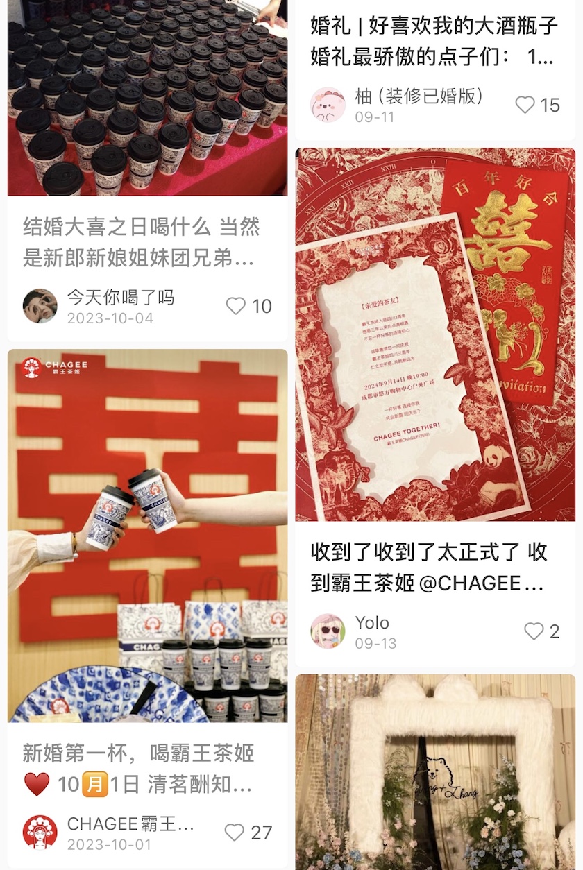 喜茶的“喜”与“囍”字同音,因而带着硕大“囍”字Logo的各款喜茶越来越多出地现在婚礼现场,它们通常被整齐排列,摆放在甜品酒水台、接待处甚至宴席上;霸王茶姬一款名为“万里木兰”的产品也因其大红色的杯身颇受欢迎,新人们端着一杯奶茶合影时,火红的点缀也与喜庆的场景相映成趣,满足人们“出片”的需求。