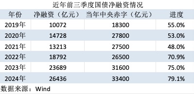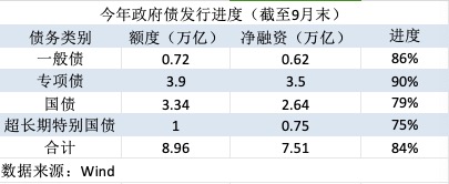 Wind数据显示,截至今年9月末,政府债净融资额为7.51万亿,完成全年额度的84%,四季度所剩额度仅有1.45万亿。
