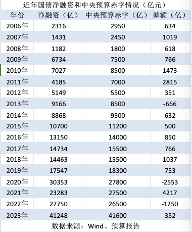 从2006年起,中国参照国际通行做法,采取国债余额管理方式管理国债发行。在余额管理下,只要国债余额低于上限,国债净融资规模可以根据经济形势等相机而定,既可以低于中央赤字,也可以高于中央赤字。