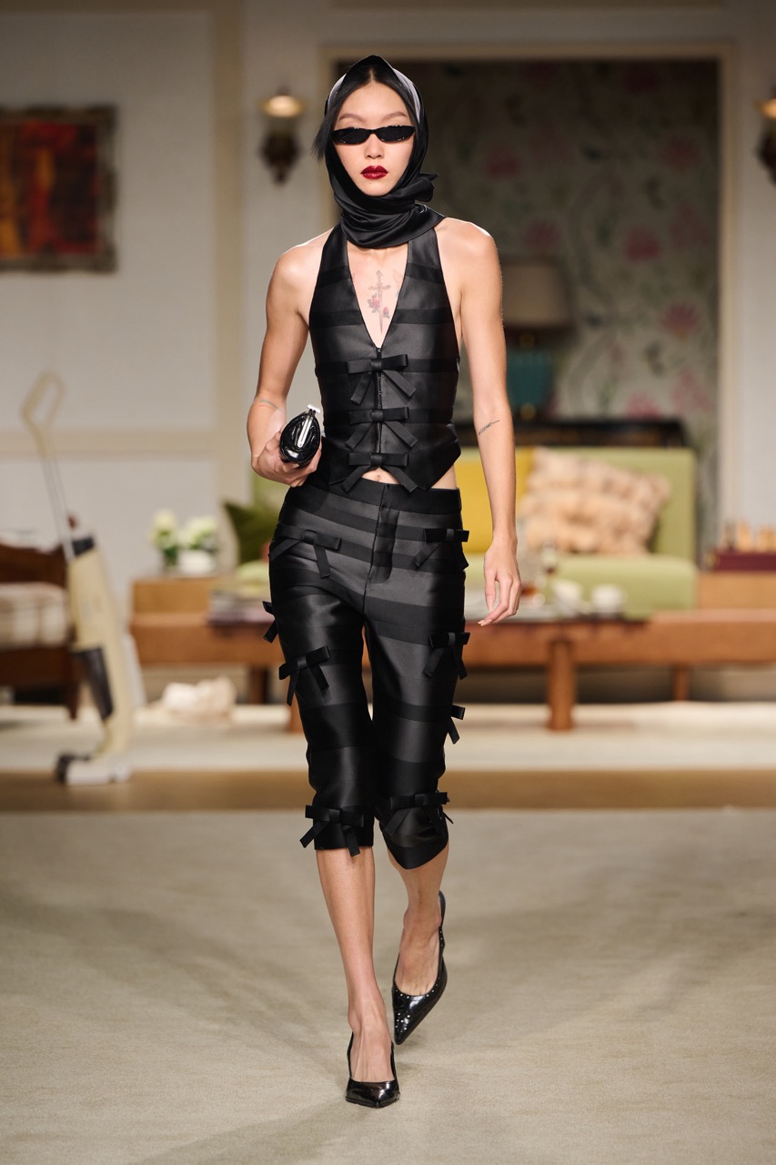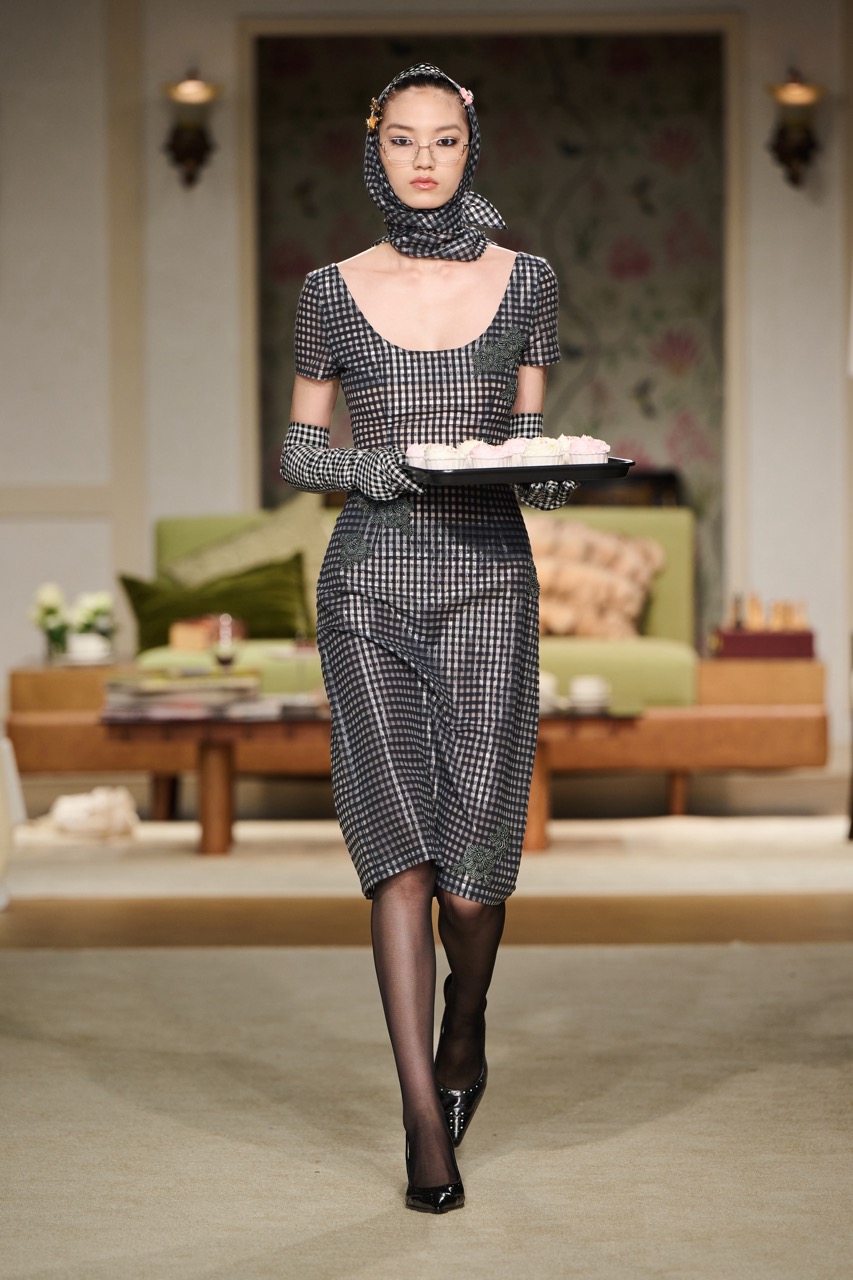 秀场还原了Charlotte的上东区公寓,奶油色调与精致装饰背后,似乎隐藏着一丝令人窒息的压抑。模特们穿梭其中,展示了一系列融合传统与前卫的设计:立体刺绣的玫瑰点缀在格纹廓形上,夸张的蝴蝶结以幽默方式呈现,而往季的单宁面料则用于塑造更为利落的轮廓。这些看似矛盾的元素,恰恰反映了Charlotte角色的内在冲突。