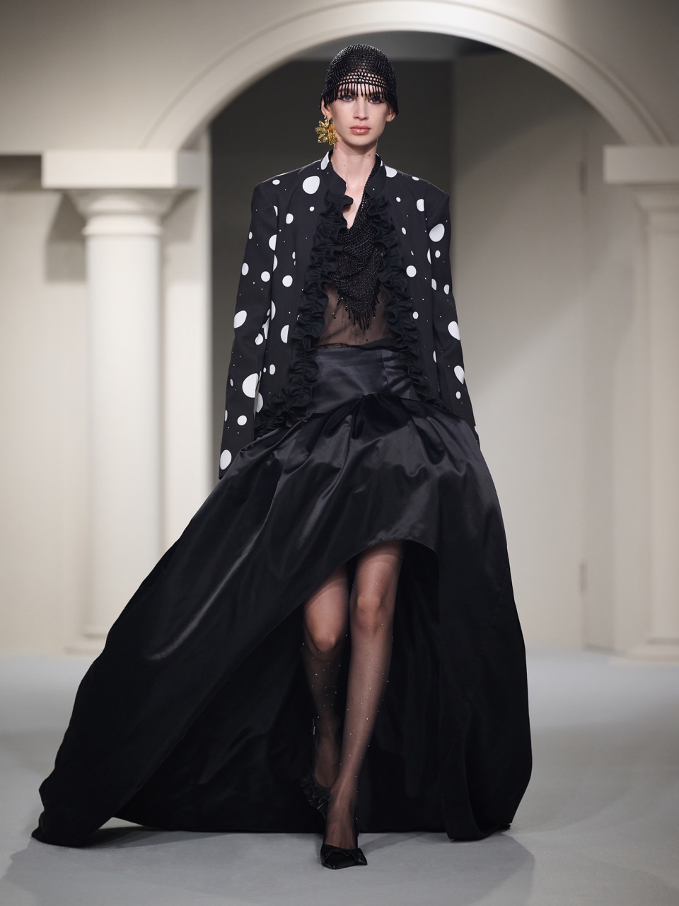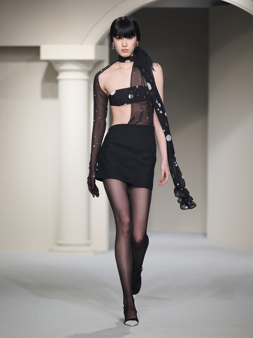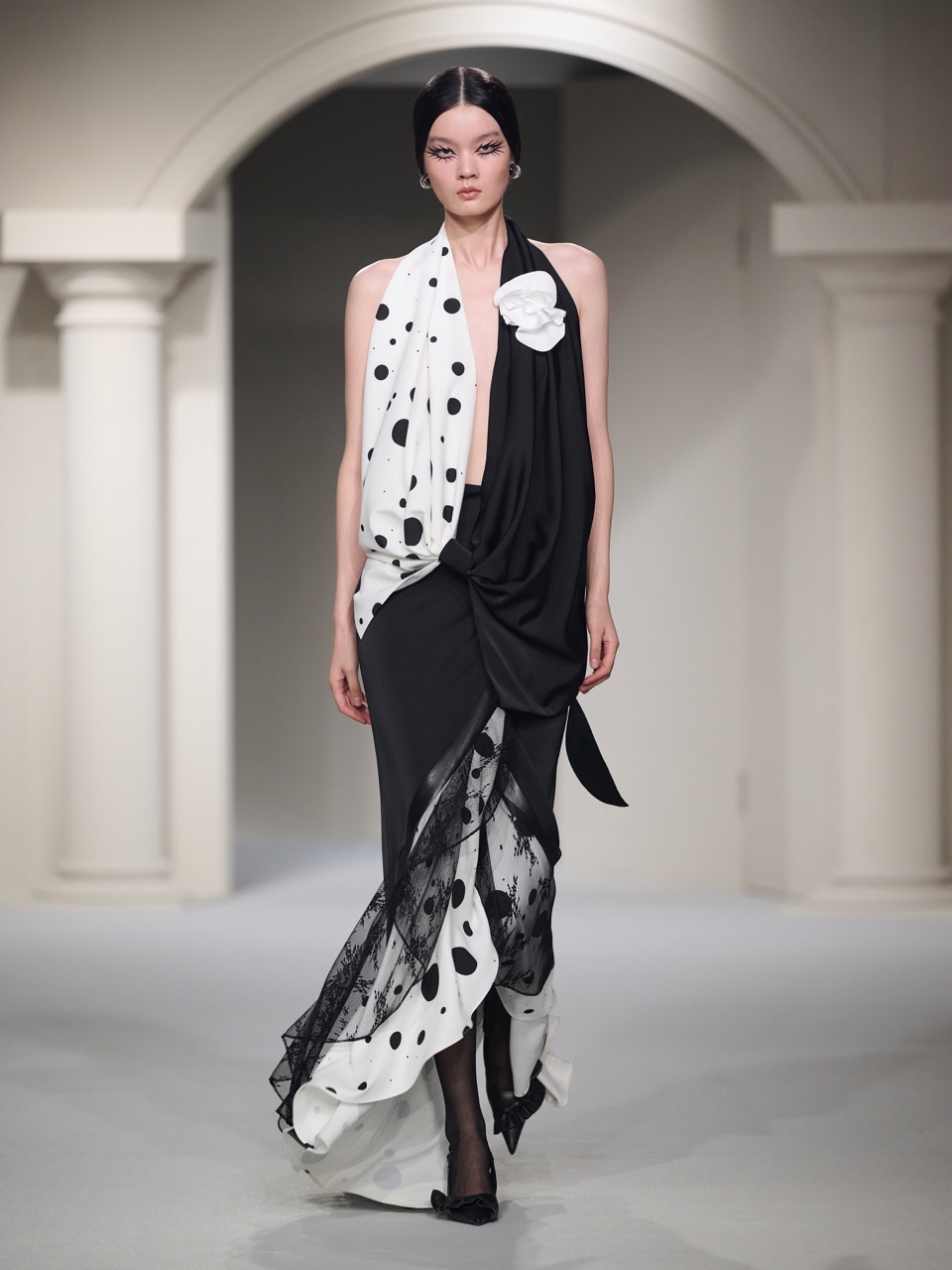 设计师运用了多种元素来诠释主题。飞扬的裙摆与流动的荷叶边成为系列的亮点,赋予服装动态美感。面料上的波点元素颇具特色,大小不一的圆点仿佛音符般跃动于轻盈透明的织物之上。零星散落的钻饰则为整体造型增添了几分精致与光彩。