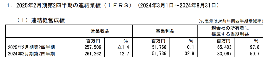 10月9日,全家便利店(FamilyMart)公布了2024年3月至8月期间的合并财务业绩。报告期内,全家营业收入为2575亿日元,同比下降1.4%;营业利润为517亿日元,同比增长0.1%;净利润为654亿日元,同比增长98%。