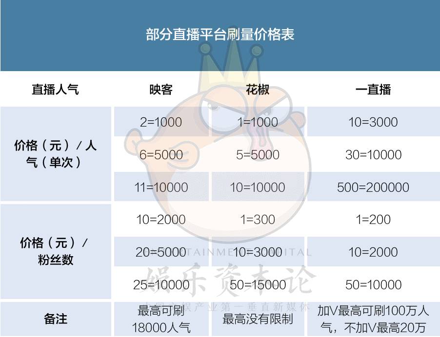 在商家发给娱乐资本论的价目表里,映客直播可刷人气从000-18000不等,分为包次、包天、包周、包月四个选择,各自对应不同的价格,另除人气外可免费添加、点亮、分享、自动聊天等功能。不过在娱乐资本论要求刷5万人气的时候,对方表示18000是人数上限,“之前所有平台只能刷到13000,18000是最近才协定好的。”另外,一直播加V主播最高可刷100万人气,不加V最高为20万,而花椒则不受限。