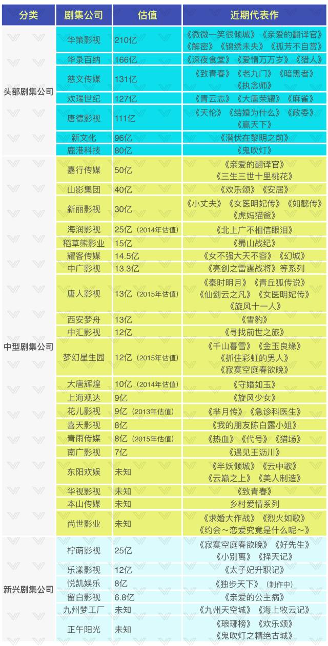《三声》根据电视剧公司的股市市值和最新融资并购,制作了这份过去一年生产爆款剧集的电视剧公司估值排行。
