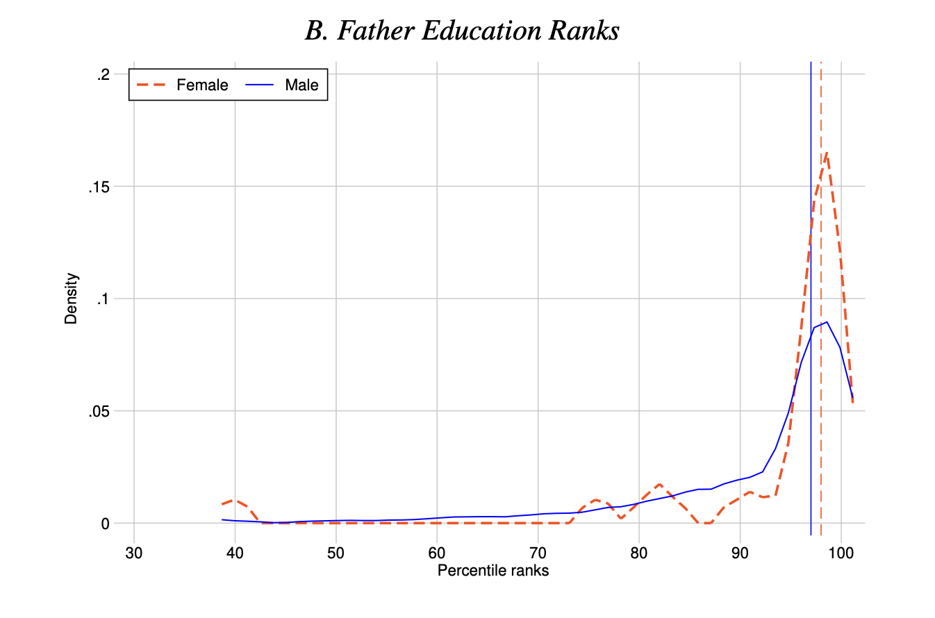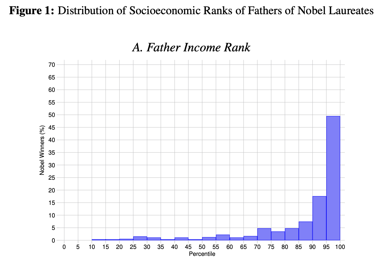 研究指出,如果机会均等,天赋随机,诺奖得主应当来自社会各个阶层,也就是说,这个百分位数应该在50上下。按照这一假设,作者估计,超过四分之三的具有潜在顶尖科学才能的孩子,因缺乏足够的家庭和社会资源支持而无法充分发挥他们的潜力。