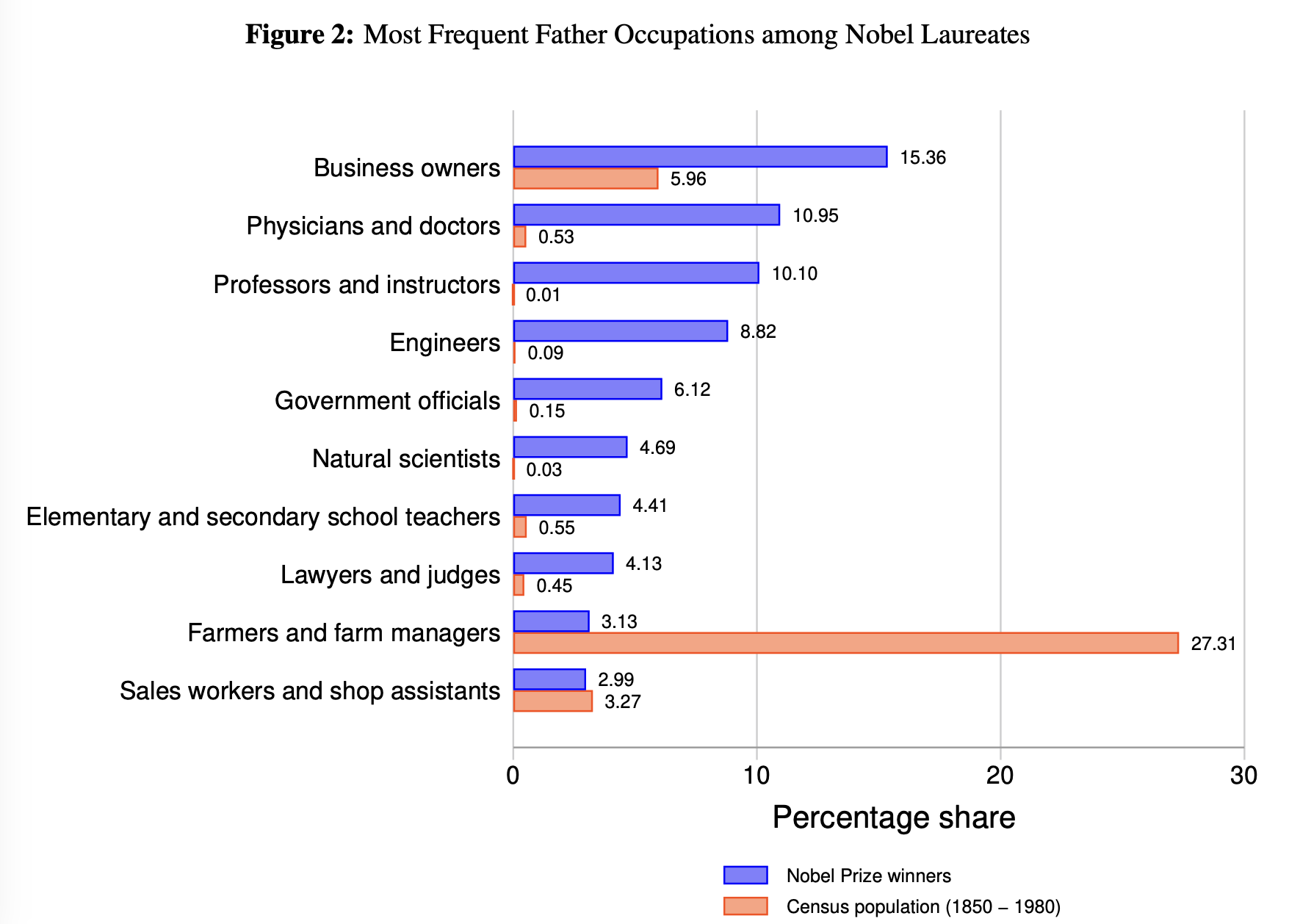 诺奖得主的父亲们,通常都从事什么职业?下图紫色代表的是诺奖得主的父亲职业占比,橙色代表的是全部人口的相关职业占比。可见,企业主、医生、教授和工程师的家庭,集中了最多的诺奖得主。相对于普查数据中这些职业的占比,教授、医生和科学家的比例高出100倍以上,而企业主的比例高出约2.5倍。