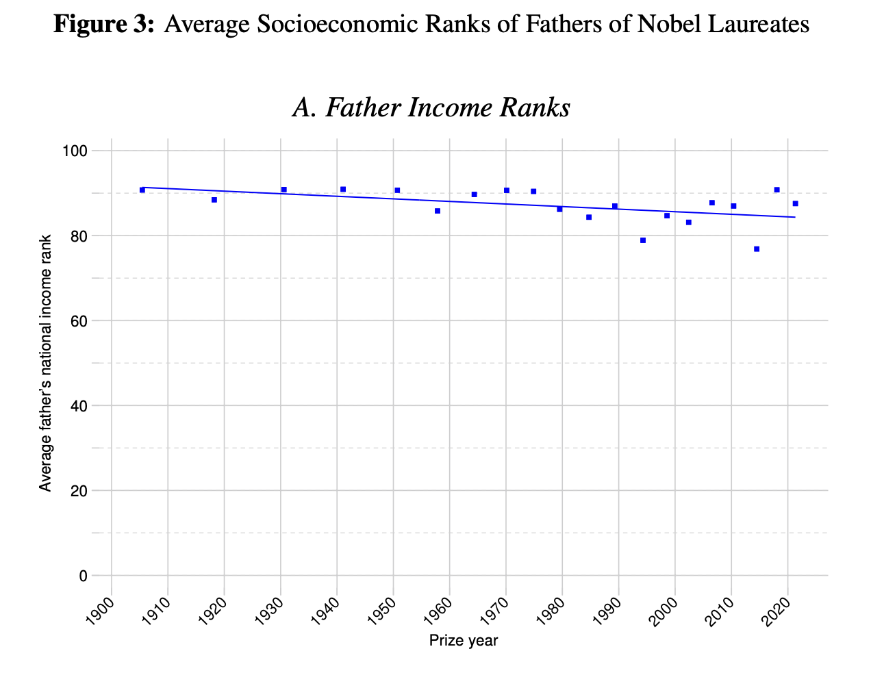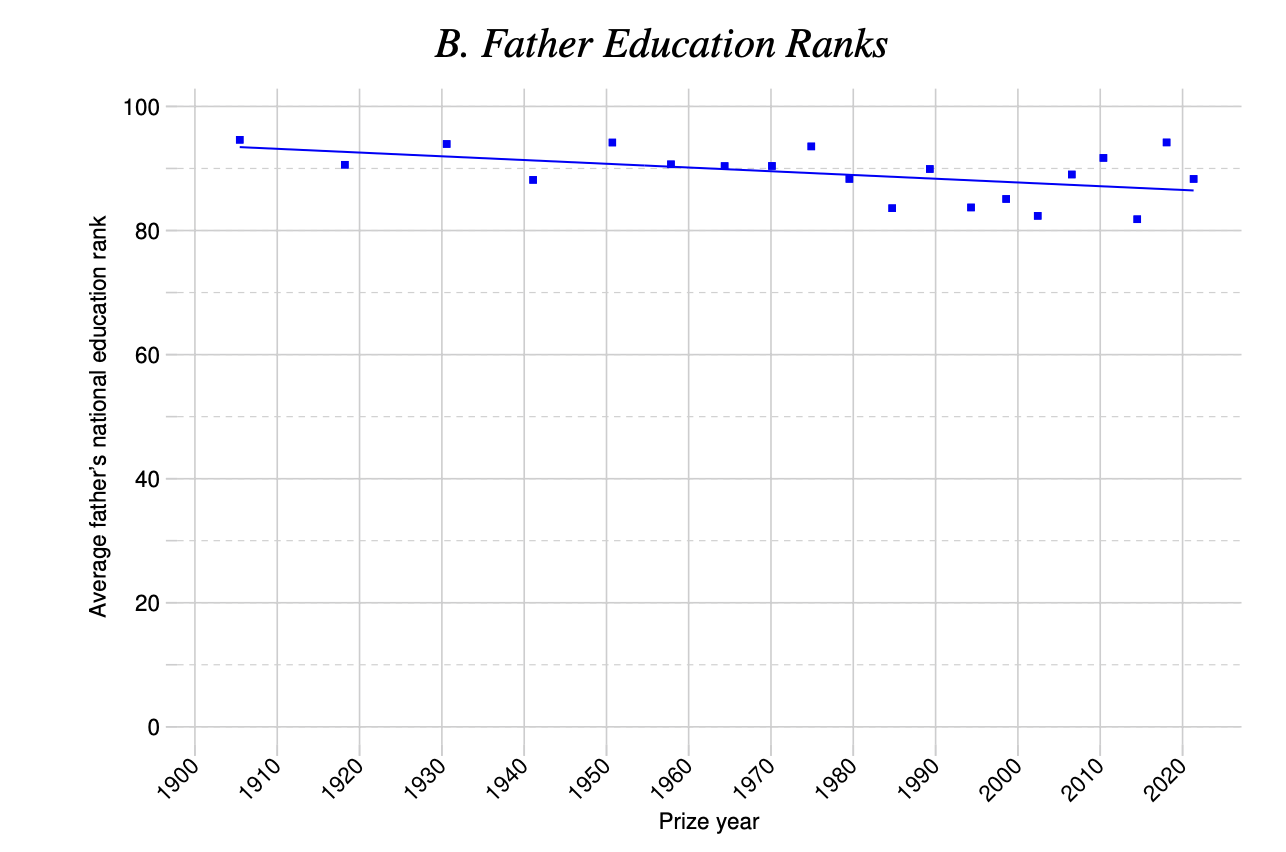 来自达特茅斯学院Paul Novosad、伦敦帝国理工大学的Sam Asher、普林斯顿大学的Catriona Farquharson,以及法尼亚大学沃顿商学院的Eni Iljazi四位研究者,查阅了从1901年到2023年数百位科学领域诺奖得主的童年情况,根据他们父亲的职业,判断他们家庭所处的社会经济地位,从而测算出顶级科技领域机会不平等的分布和历史变化。