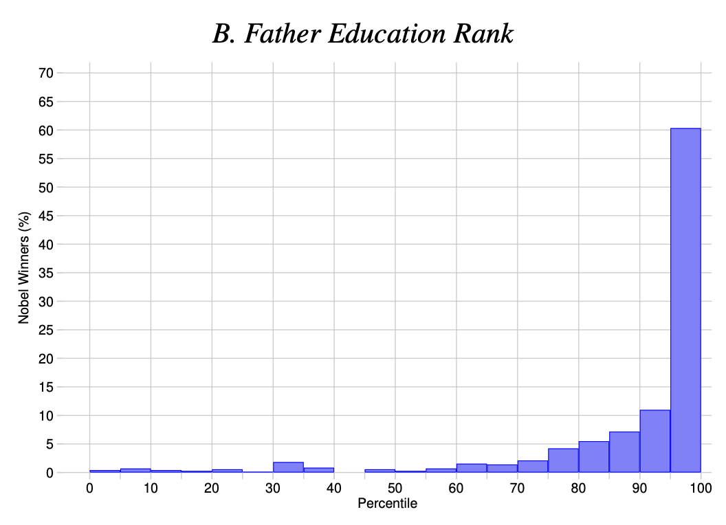 数据显示,诺奖得主的父亲其收入平均处于其所在国第87百分位,教育水平在第90百分位。超过三分之二的诺奖得主来自本国最富裕的10%家庭,50-60%的诺奖得主来自教育水平位列前5%的家庭。这表明,能够获得进入科学顶尖领域机会的,往往是社会财富和教育资源高度集中的人群。