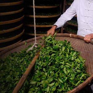 制作铁观音的第一步就是晒青,也叫萎凋。这一工序是利用太阳光照射、自然吹风或者室内加温,使鲜叶适度散失部分水分,适当破坏叶绿素,散发青草气味,使鲜叶中内含物开始发生化学变化,叶质变软,为之后的摇青创造良好条件。接下来就是摇青,这也是观音韵香韵形成非常重要的一步。摇青就是在外力的作用下,使鲜叶发生旋转,碰撞、摩擦,这样叶片表面和边缘就会受到损伤,细胞破损而流出叶汁,达到促进内含物渗透酶促氧化作用,铁观音的“绿叶红镶边”就是在这一时期形成的。