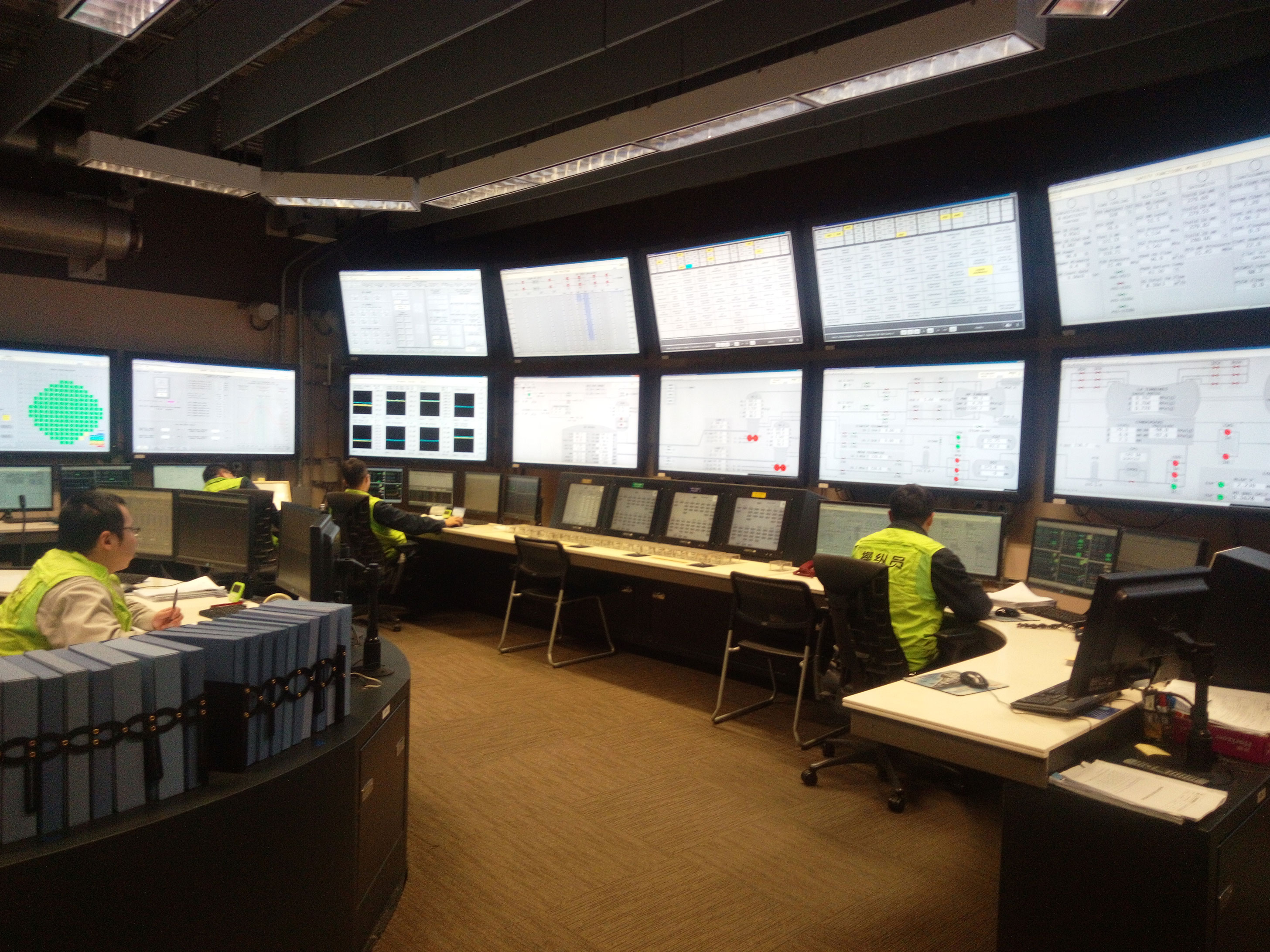 主控室内的墙面上,铺满了16台显示屏,屏幕上实时展现着一、二回路系统的重要参数、报警显示盘、重要参数变化趋势。