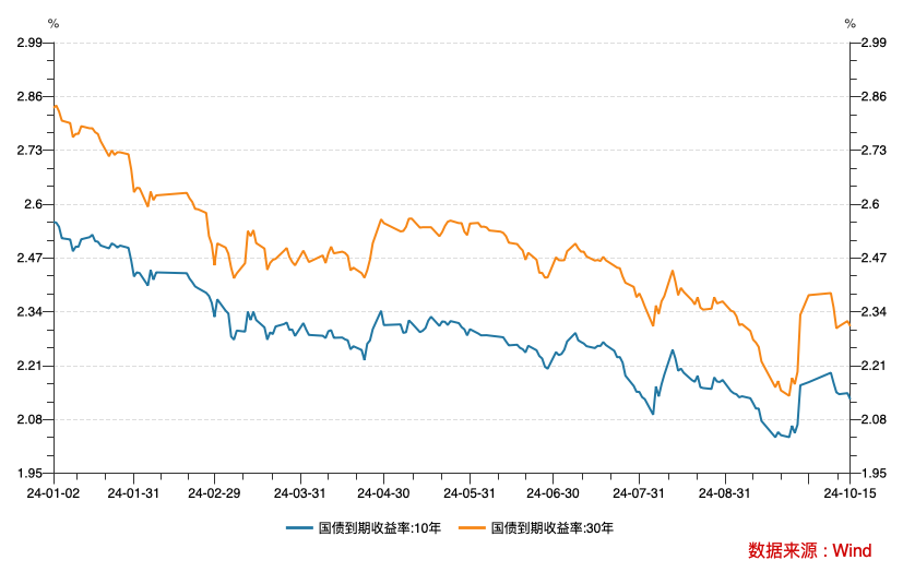 9月24日的发布会宣布一系列政策后,债市已大幅回调市场也高度关注债市是否会再次出现“理财赎回—债市下跌”的负反馈。Wind数据显示,10年期、30年期国债收益率一度分别反弹至2.2%、3.8%。10月16日10年期、30年期国债收益率分别为2.11%、2.30%,分别相比9月23日上行8BP、16BP。