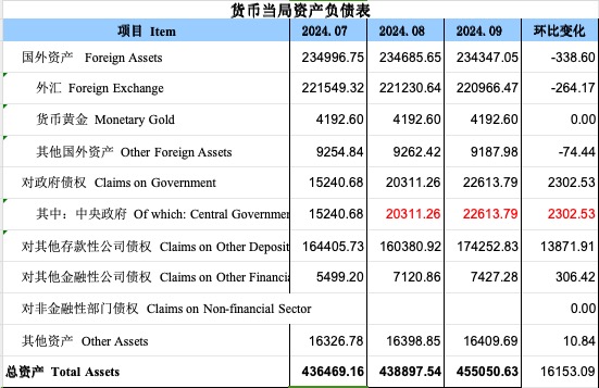 中国人民银行近日公布的货币当局资产负债表显示,截至9月末央行对中央政府债权余额为2.26万亿元,相比8月末增加2302亿元。这是该科目在8月增长后再度增长。