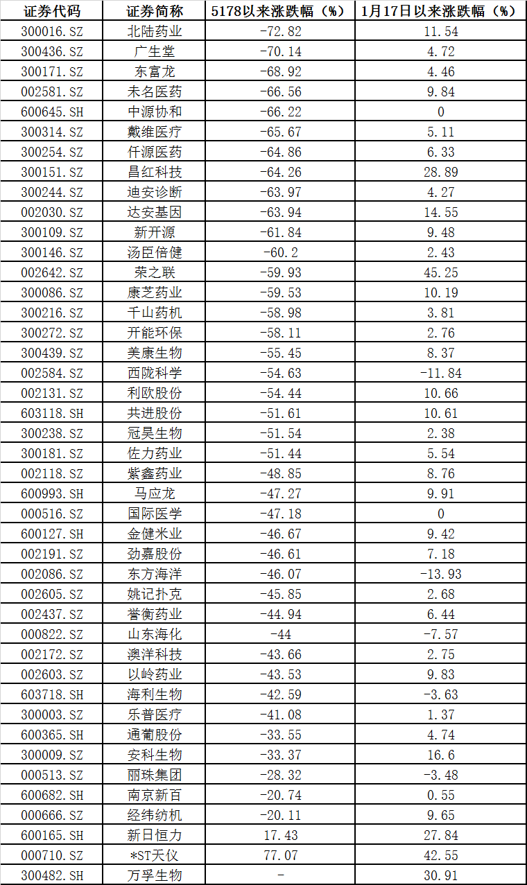 从上表中不难看出,截至到3月17日收盘,上述43家上市公司中有半数的股价相对于5178点“腰斩”,股价跌幅处在40%-50%区间的上市公司也达到了13家,仅有基因检测另一龙头公司——贝瑞和康借壳的*ST天仪(000710.SZ)以及之前收购博雅干细胞的新日恒力(600165.SH)实现上涨。