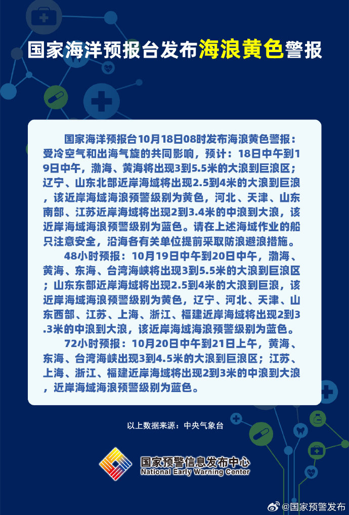 国家海洋预报台10月18日08时发布海浪黄色警报:受冷空气和出海气旋的共同影响,预计:18日中午到19日中午,渤海、黄海将出现3到5.5米的大浪到巨浪区;辽宁、山东北部近岸海域将出现2.5到4米的大浪到巨浪,该近岸海域海浪预警级别为黄色,河北、天津、山东南部、江苏近岸海域将出现2到3.4米的中浪到大浪,该近岸海域海浪预警级别为蓝色。