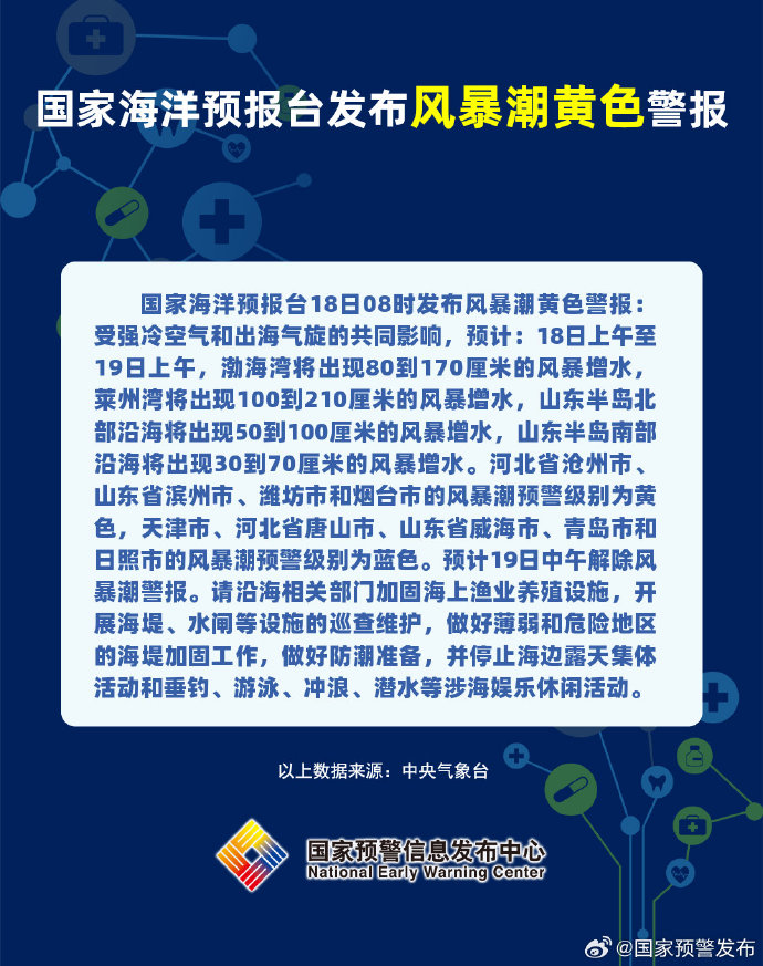 国家海洋预报台18日08时发布风暴潮黄色警报:受强冷空气和出海气旋的共同影响,预计:18日上午至19日上午,渤海湾将出现80到170厘米的风暴增水,莱州湾将出现100到210厘米的风暴增水,山东半岛北部沿海将出现50到100厘米的风暴增水,山东半岛南部沿海将出现30到70厘米的风暴增水。河北省沧州市、山东省滨州市、潍坊市和烟台市的风暴潮预警级别为黄色,天津市、河北省唐山市、山东省威海市、青岛市和日照市的风暴潮预警级别为蓝色。预计19日中午解除风暴潮警报。