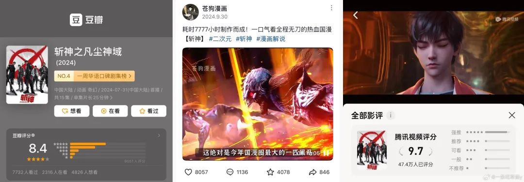 除了豆瓣评分一路走高,在收视率研究中心、花渣聚集地等娱乐小组,近期关于《斩神之凡尘神域》的讨论也明显增多,隐然有跨组刷屏之势。在抖音,斩神相关话题播放量破30亿,许多博主纷纷自发力荐,更有人耗时777小时制作了一期长达8小时的安利视频,称之为“今年国漫圈最大的一匹黑马”。