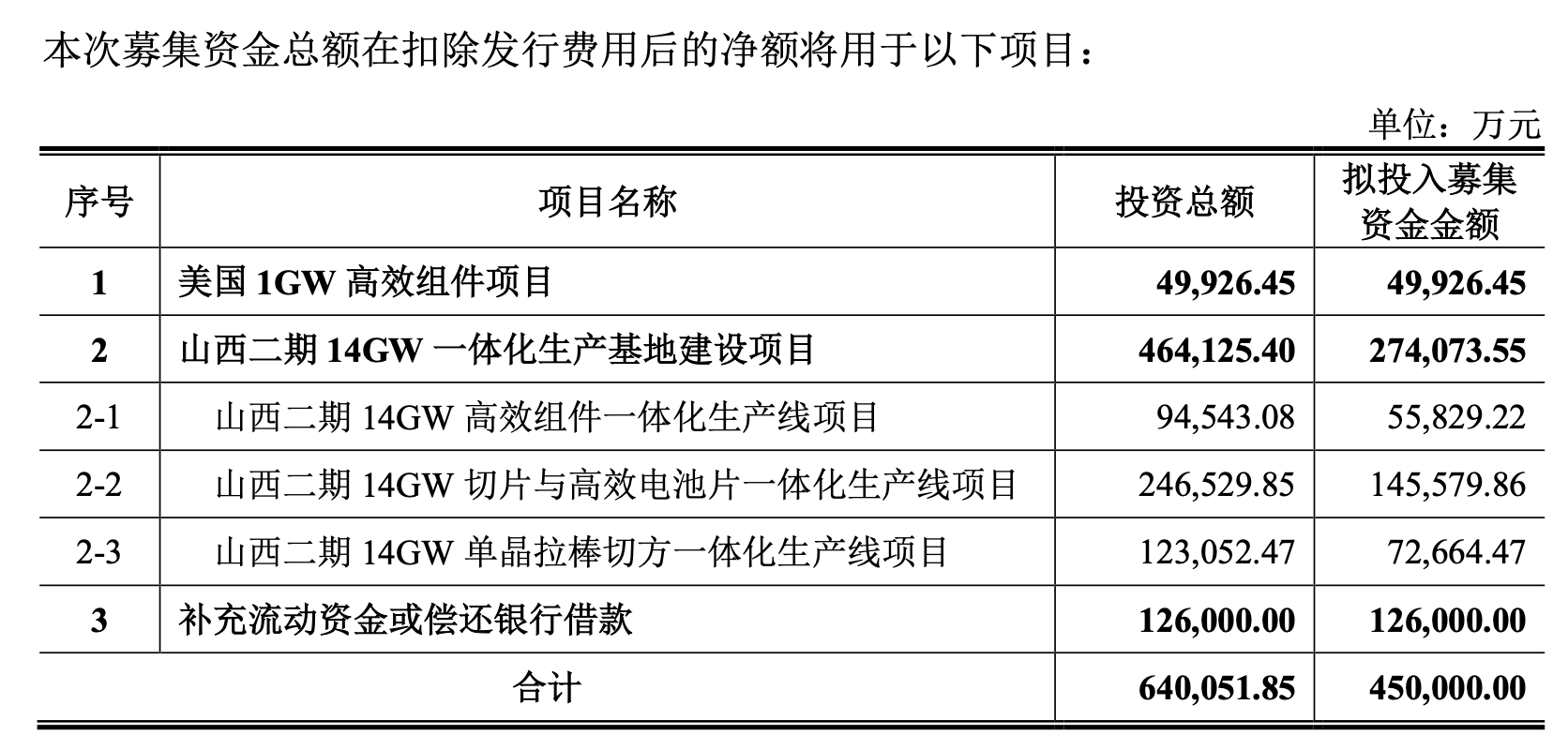 募集资金总额将主要用于晶科能源美国1 GW高效组件项目、山西二期14 GW一体化生产基地建设项目以及补充流动资金或偿还银行借款。