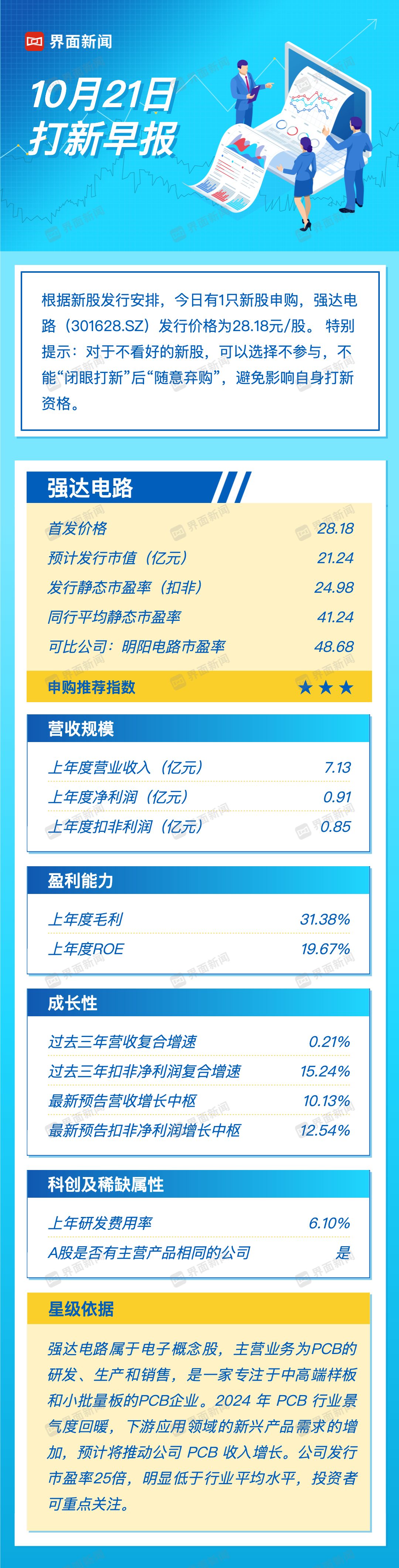 根据新股发行安排,今日有1只新股申购,强达电路(301628.SZ)发行价格为28.18元/股。