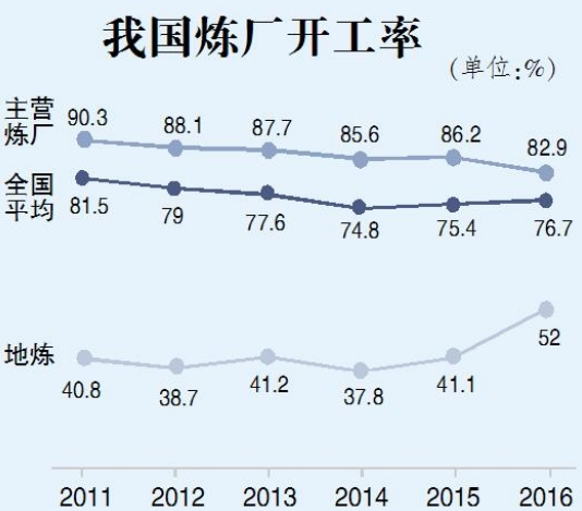 据中国石油经济技术研究院(下称中石油经研院)数据显示,截至2016年底,中国炼油能力已达7.5亿吨/年,占全球炼油能力的15%,居世界第二位,仅在美国之后。其中全国地方炼厂(含央企收购或控股的地炼企业)的炼油总产能为2.62亿吨/年,占全国炼油总产能的34.8%。“三桶油”总产能则从2010年的90%降至2016年的76.2%,成品油市场格局出现较大变化。