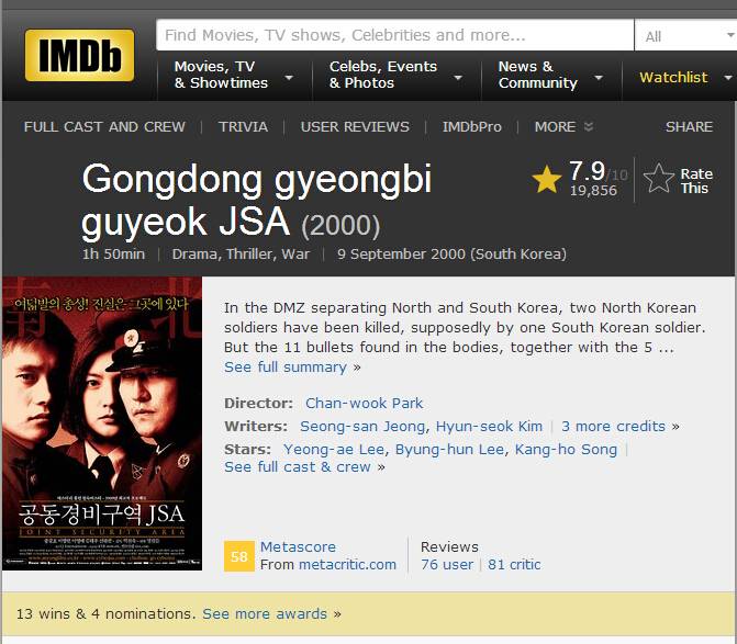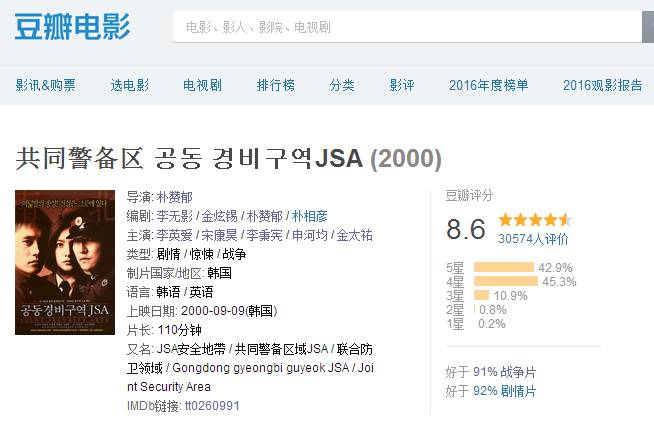 即使拿出后来比肩好莱坞级大制作的《太极旗飘扬》(豆瓣8.3),《共同警备区JSA》在剧情设计和人性挖掘方面也胜出不止一筹。