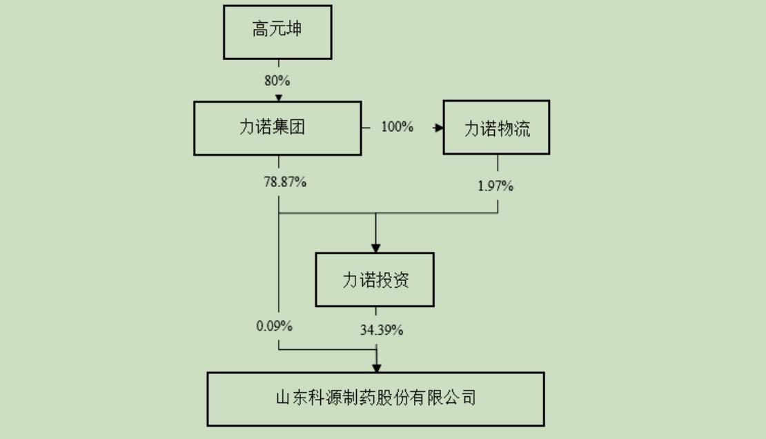 其中,力诺投资、力诺集团合计持有宏济堂39.68%的股份,为控股股东;力诺投资持有科源制药34.39%的股份,是科源制药的控股股东,高元坤间接控制上市公司34.48%股权。