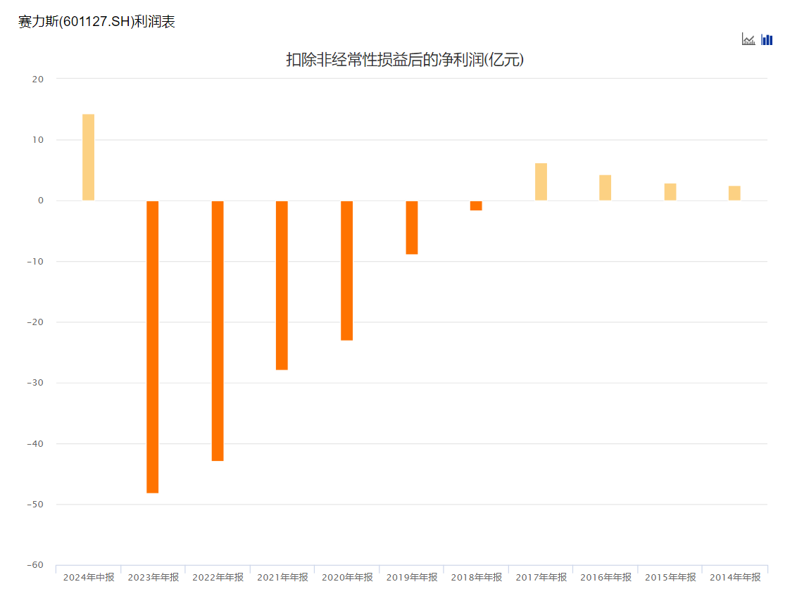 需要注意的是,赛力斯持续押注在智能电动汽车,自2018年开始业绩就陷入亏损境地,2018年至2023年连续5年扣非后归母净利合计巨亏152.61亿元。进入2024年才由亏转盈,今年一季度扣非后归母净利为1.14亿元,今年上半年这一数字为14.37亿元。