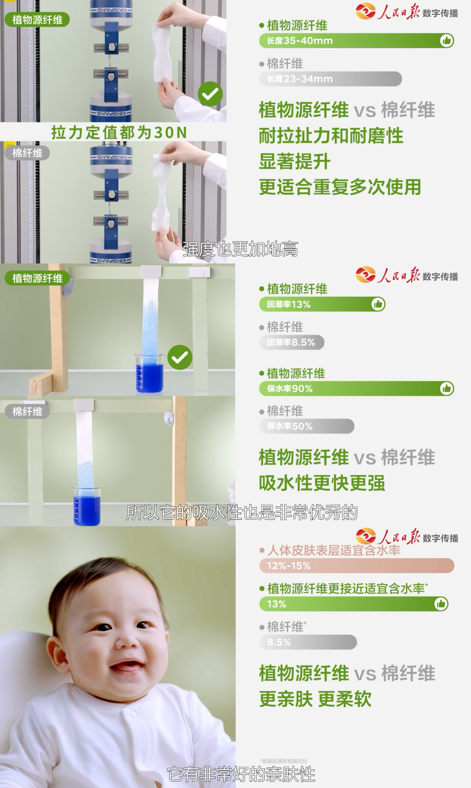 从材料特性来说,植物源纤维比天然材料性能更优。就此前人民日报社报道的测试结果显示,植物源纤维对比棉纤维,在耐拉扯性、耐磨性、吸水性、亲肤性等多方面都具备明显提升。