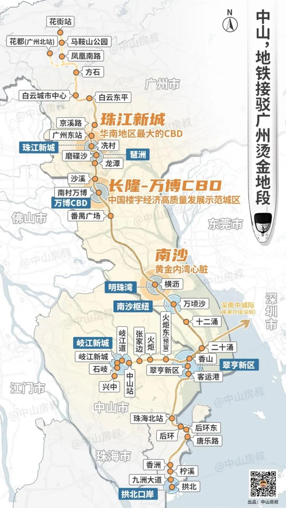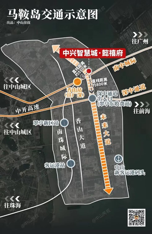 如果说马鞍岛是深中融城的桥头堡,那么项目所在核心位置,堪称马鞍岛与前海的桥头堡,距离深中通道出入口仅800米,是深中通道进入中山的“第一道风景线”。同时,项目距离香山地铁站仅约700米,是南中城际(在建)进入中山的首站上盖新盘,区位得天独厚。