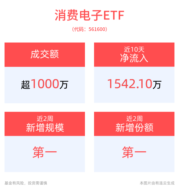 规模方面,消费电子ETF近2周规模增长674.49万元,实现显著增长,新增规模位居可比基金1/7。份额方面,消费电子ETF近2周份额增长500.00万份,实现显著增长,新增份额位居可比基金1/7。