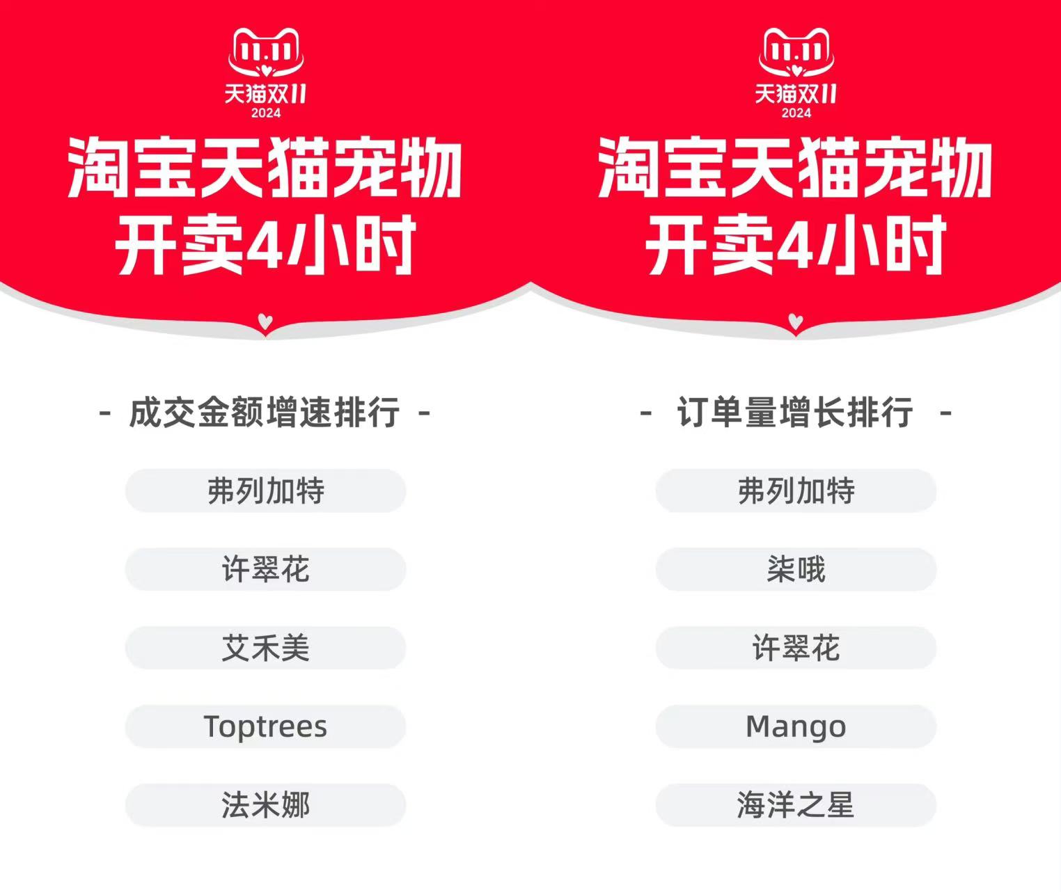比如天猫数据提到,10月21日8点后开卖4小时,弗列加特、柒哦、许翠花、Mango、海洋之星成为订单量同比增长最快的五大宠物品牌。
