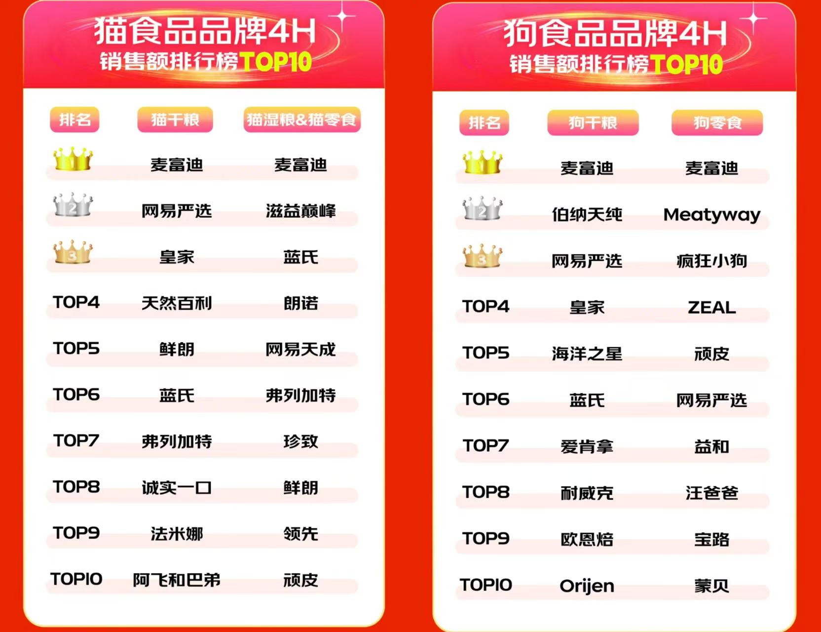 京东的数据显示,10月21开抢日前4小时,麦富迪占据了猫干粮、猫湿粮&猫零食、狗干粮和狗零食品牌4个销售额排行榜的第一名。