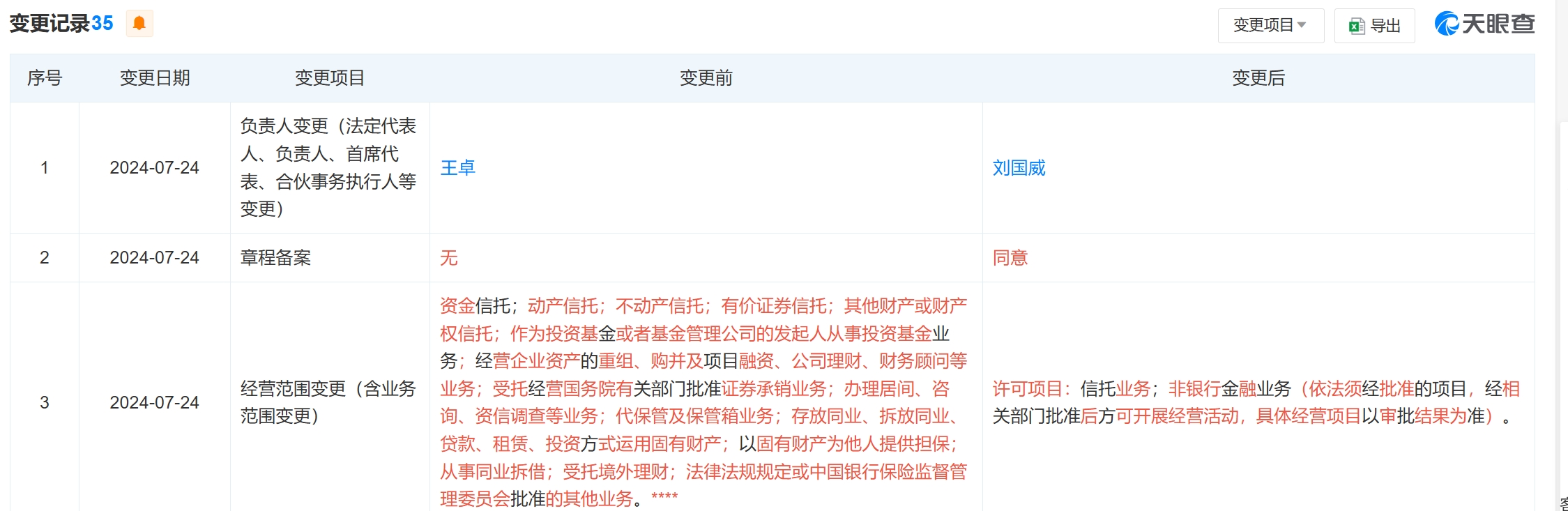 值得一提的是,天眼查app显示,7月24日,王卓卸任了五矿信托法定代表人,后于7月27日,由公司董事长刘国威新任五矿信托法定代表人。