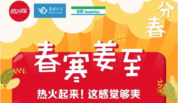 可口可乐还联合了墨迹天气在上海、杭州、苏州、无锡等地的全家便利店开展了营销活动:当墨迹天气显示多云、阴天、雨天,消费者就可在上述地区的全家便利店以2元优惠价换购姜味可口可乐。不知道阴雨天会不会更受欢迎。