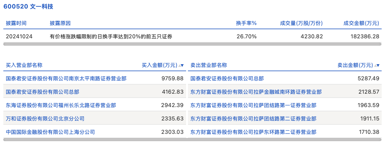 10月24日,文一科技今日涨停,龙虎榜数据显示,上榜营业部席位全天成交3.45亿元,占当日总成交金额比例为18.92%。其中,买入金额为2.15亿元,卖出金额为1.3亿元,合计净买入8502.58万元。