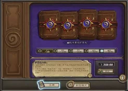 上述这些获得方式,都需要玩家投入大量时间、精力才有可能完成。而在此之外,对于想要获得高品质卡牌的玩家,《炉石传说》还提供了一种更直接的方式: 通过花钱购买扩展包,便可轻松地获得大量卡牌(扩展包单价为每包9元,很多玩家购买的40包和60包两档组合,价格分别为328元和388元)。