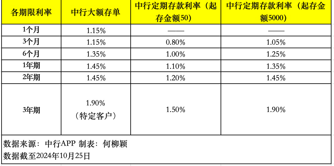 10月18日,中国银行发售2024年第二期个人大额存单,发售产品包括1个月、3个月、6个月、1年、2年、3年共计六个期限,年化利率分别为1.15%、1.15%、1.35%、1.45%、1.45%、1.90%(面向特定客户),均支持转让,转让时最低持有期为1天。