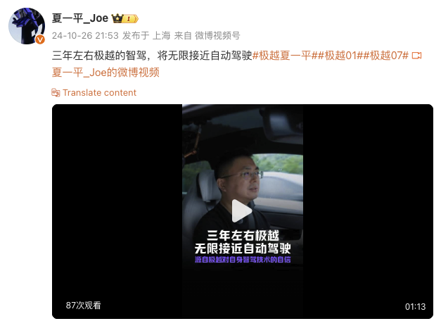 10月26日晚,极越CEO夏一平在微博发布视频称,三年左右极越的智驾,将无限接近自动驾驶。夏一平表示,“现在的智驾不是像以前一样是个单机智能的问题,靠的是大模型,靠的是算力。”