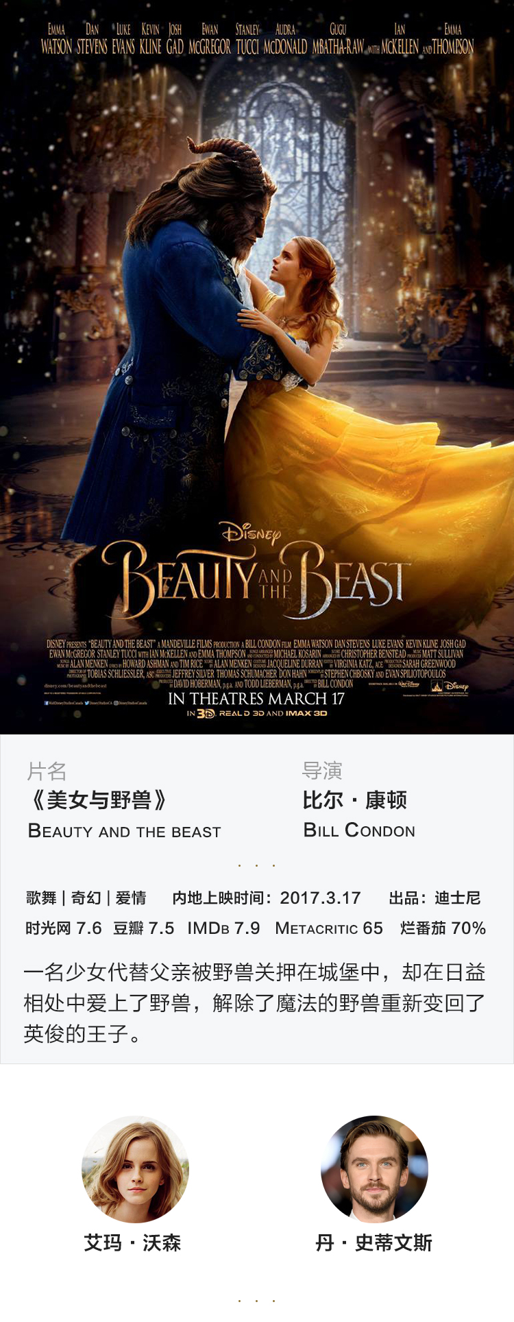 帅绝英伦三岛的丹·史蒂文斯只在影片最后几分钟露了下真容,而且全是中景和远景,还只有侧面,导演怎么忍心只拿这张俊脸来动作捕捉?也许他正是不想让观众迷恋王子的美貌,这也是“美女与野兽”这个童话故事一直告诫人们的:不要以貌取人,外表不能说明一切。