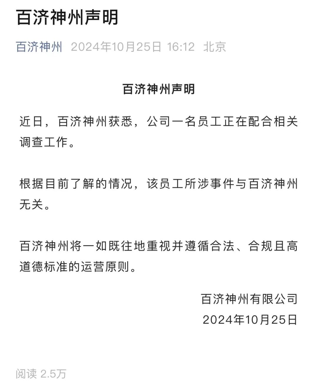 10月25日,A股闭市之后,百济神州在官方微信公众号发布声明称,获悉公司一名员工正在配合相关调查,但据了解,该员工所涉事件与百济神州无关。百济神州将一如既往地重视并遵循合法、合规且高道德标准的运营原则。