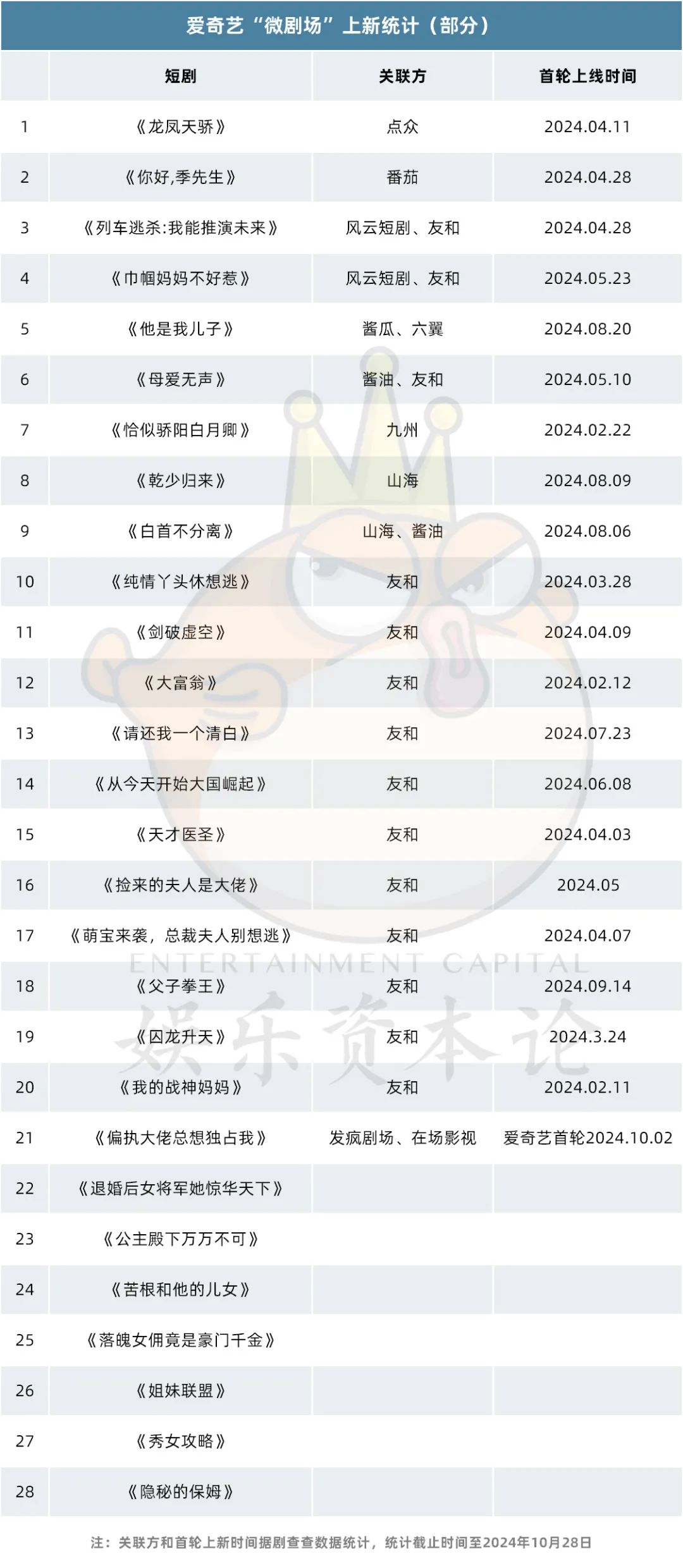 据娱乐资本论统计,爱奇艺微剧场从9月27日开始保持日更,目前已有52部竖屏短剧上线,其中至少60%以上是二轮剧。有像《母爱无声》这样的端原生亲情类爆款,有女频甜宠、古装、复仇等爆款题材,男频短剧也不少,涵盖逆袭、战神、神医等不同内容。