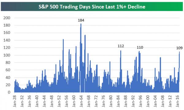 在过去的110天里,美股从未出现过1%以上的跌幅,这个纪录在昨天告终。