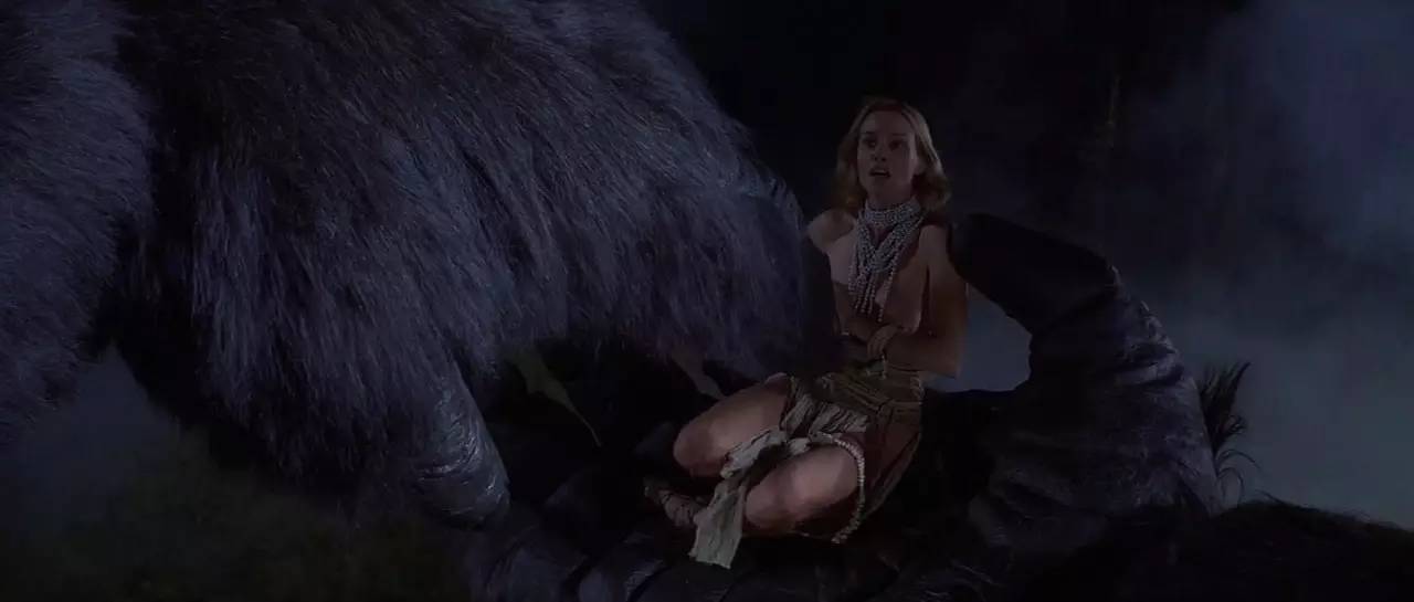 这一作整体质量不算高,但优点也不是没有。首先是金刚与戴安的关系发生了微妙的变化,与1933年金刚的一厢情愿相比终于迈向了大家熟悉的悲剧恋情。前半段美丽的杰西卡为我们塑造了金刚电影史上最“傻白甜”的女主角,天真可爱的甚至有些过头。不过后期她对于金刚也不是百分百的恐惧了,她虽然知道这样的感情有多么荒谬,但她也试图去理解这只野兽内心的情感。