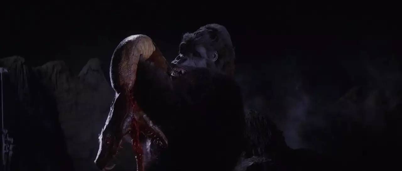 另一点就是猎奇的风格,无论是金刚撕烂了巨蛇的嘴还是金刚被直升机打成了筛子,这种血腥程度绝对是导演故意的吧,最后金刚真的是血肉模糊啊。还有一段最夸张的戏份,就是金刚居然试图脱去戴安的衣服?!老哥,稳!这逼得我查遍了每一个删减片段...(什么?我什么也没想啊!)
