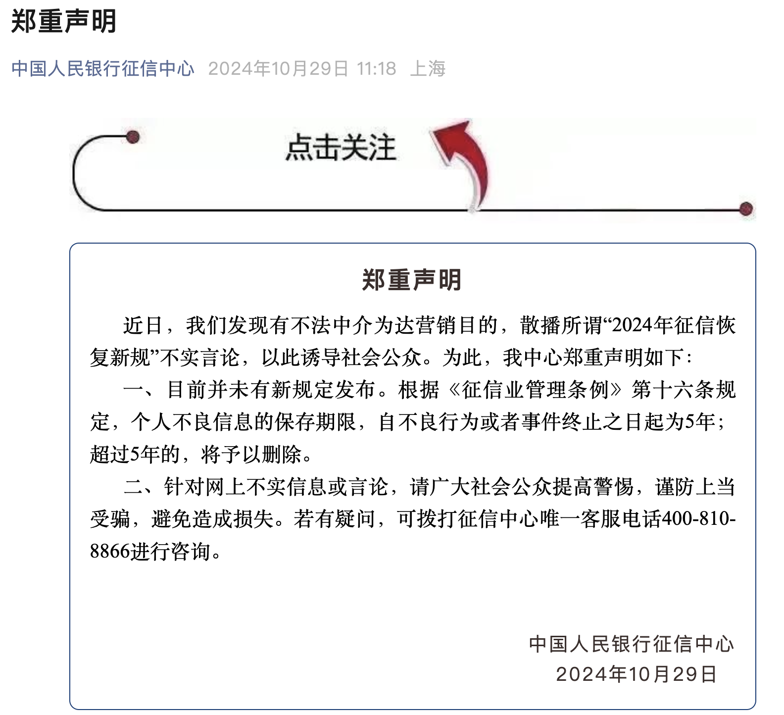 近日,我们发现有不法中介为达营销目的,散播所谓“2024年征信恢复新规”不实言论,以此诱导社会公众。为此,我中心郑重声明如下: