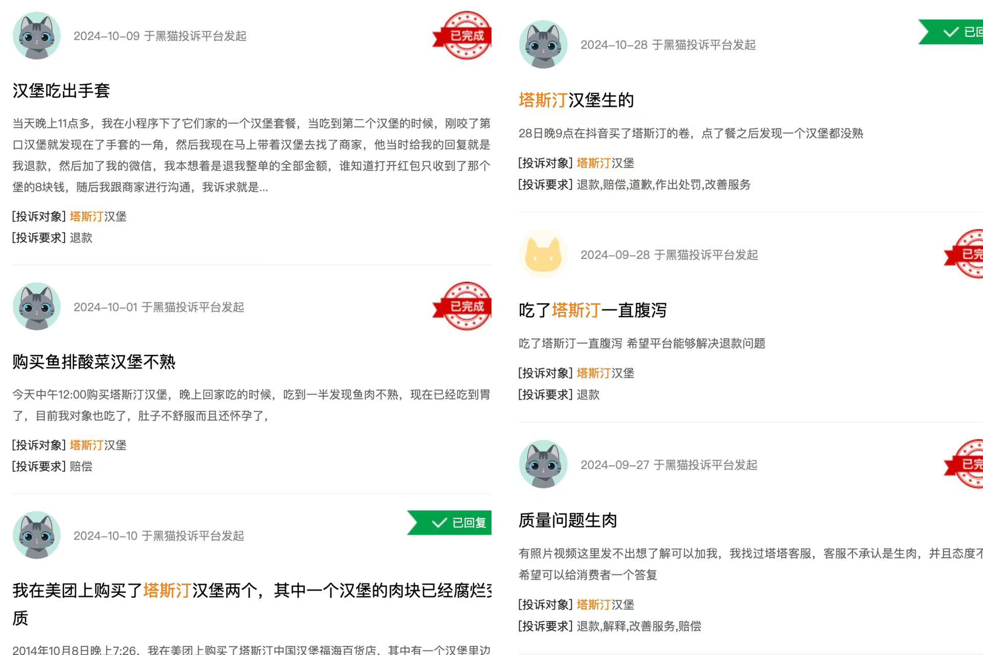 目前在黑猫投诉平台上,与塔斯汀相关的投诉信息达3728条,关于食品安全的反映中,不仅包括汉堡中吃出石头、手套等异物,也包括吃出生肉、肉块腐烂变质的情况。直接以“塔斯汀生肉”为关键词进行检索,显示的相关投诉也有118条。