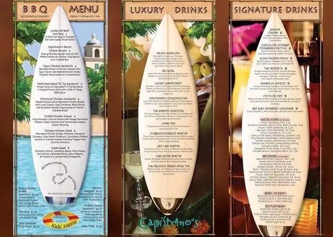 再高一个级别的创意菜单就要结合餐厅的属性或菜品的特色了。比如一家音乐餐厅把菜单做成光盘的模样,无疑会更受欢迎;如果你开了一家热带主题餐厅,把菜品印在冲浪板上必定会吸引顾客的目光;再比如,一家咖啡厅把每种咖啡的冲调配方全都形象地标注出来,你会不会对它刮目相看?