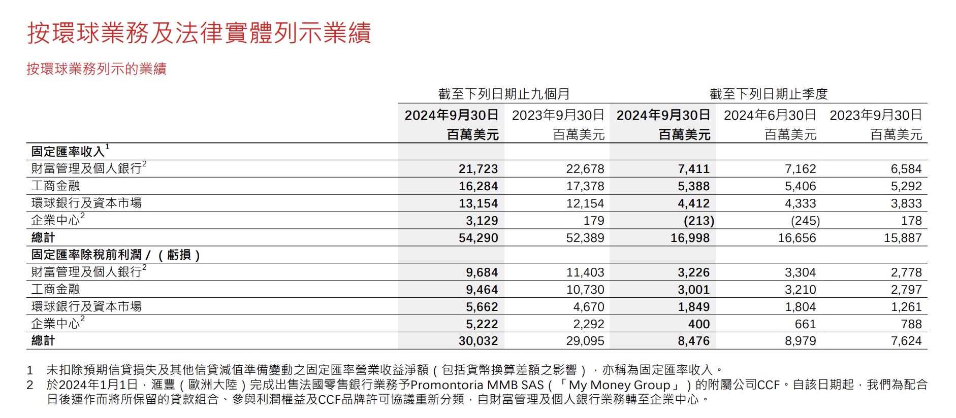 从三大业务板块来看,按固定汇率基准计算,财富管理及个人银行除税前利润为97亿美元,较2023年前九个⽉减少17亿美元。