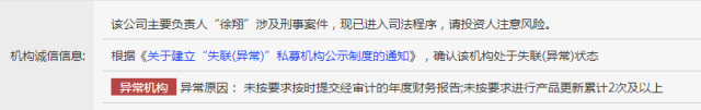 在中国基金业协会的官网上,泽熙投资被列入异常机构名单的理由是:“未按要求按时提交经审计的年度财务报告;未按要求进行产品更新累计2次及以上”,同时协会官网信息也提示,“该公司主要负责人‘徐翔’涉及刑事案件,现已进入司法程序,请投资人注意风险。”